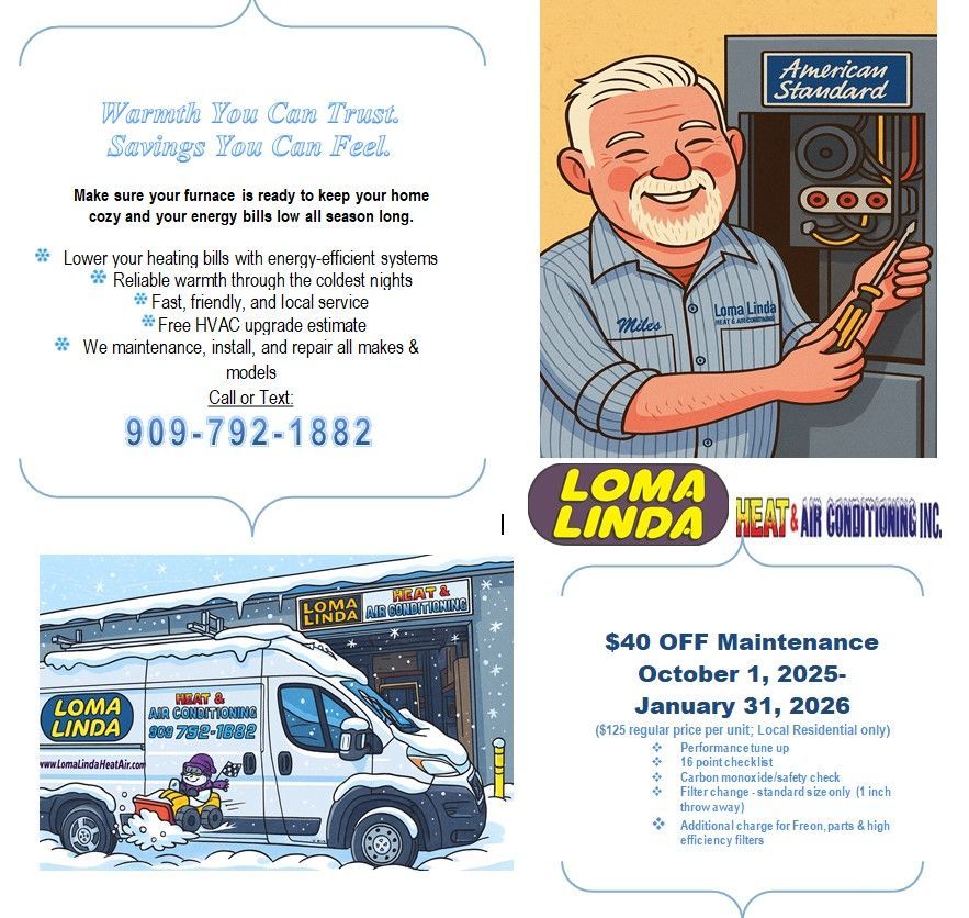Whether you need a completely new system, or you just need a partner that will maintain your system so that you don't encounter costly repairs in the future, Loma Linda Heat & Air Conditioning Inc. is your partner. With over 20 years in business, deep ties to the Loma Linda and Inland Empire communities, and a solid track record of reliable, fair and honest service experiences, we want to be your partner too!